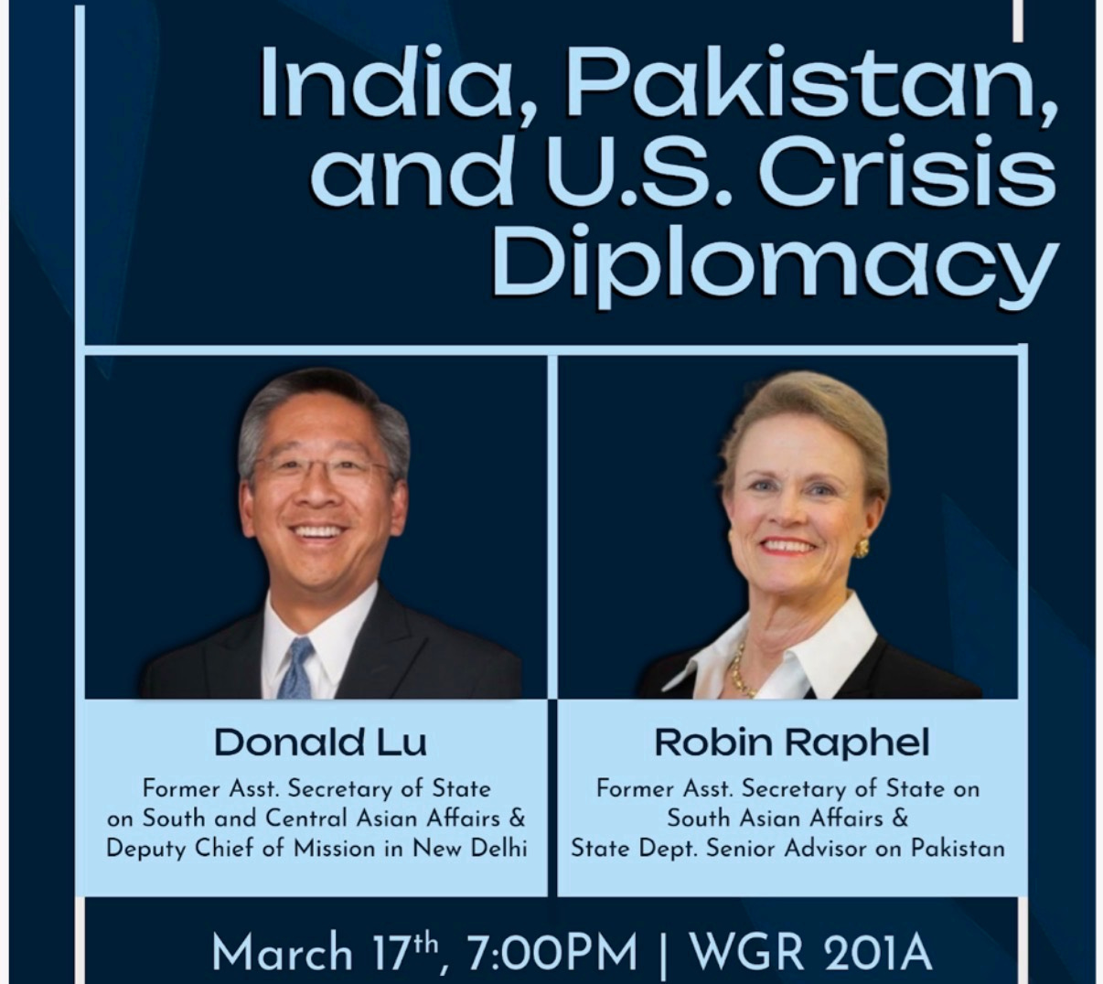 On March 17th, the Stratagem Initiative and the Washington Forum on India are hosting “India, Pakistan, and U.S. Crisis Diplomacy: A Conversation with Ambassadors Donald Lu and Robin Raphel” to hear from experts on the region and discuss the aftermath of the May 2025 conflict as well as the future of U.S. diplomacy between the two countries.